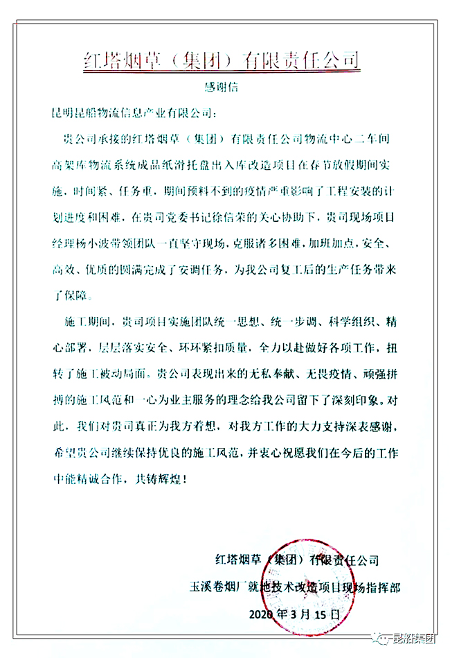 困難面前不畏艱險,疫情面前逆行而上,物流公司實施團隊用他們的無私奉獻,為昆船物流再一次樹立了口碑,爭取了榮譽,公司發展過程中,用戶的認可是的必不可少的條件,公司全體職工將努力向優秀的團隊和職工學習,全力以赴為公司高質量發展做出貢獻。  |